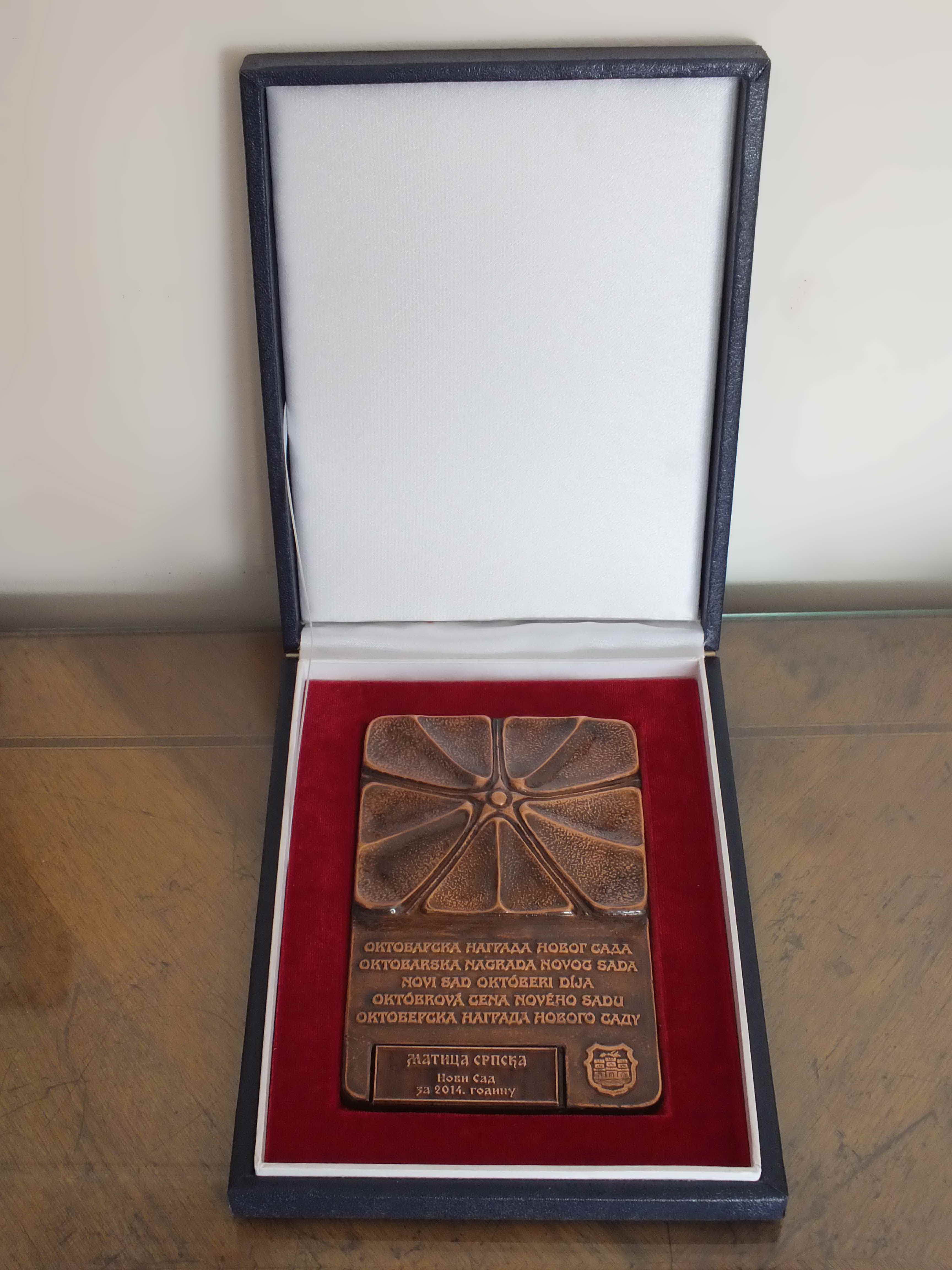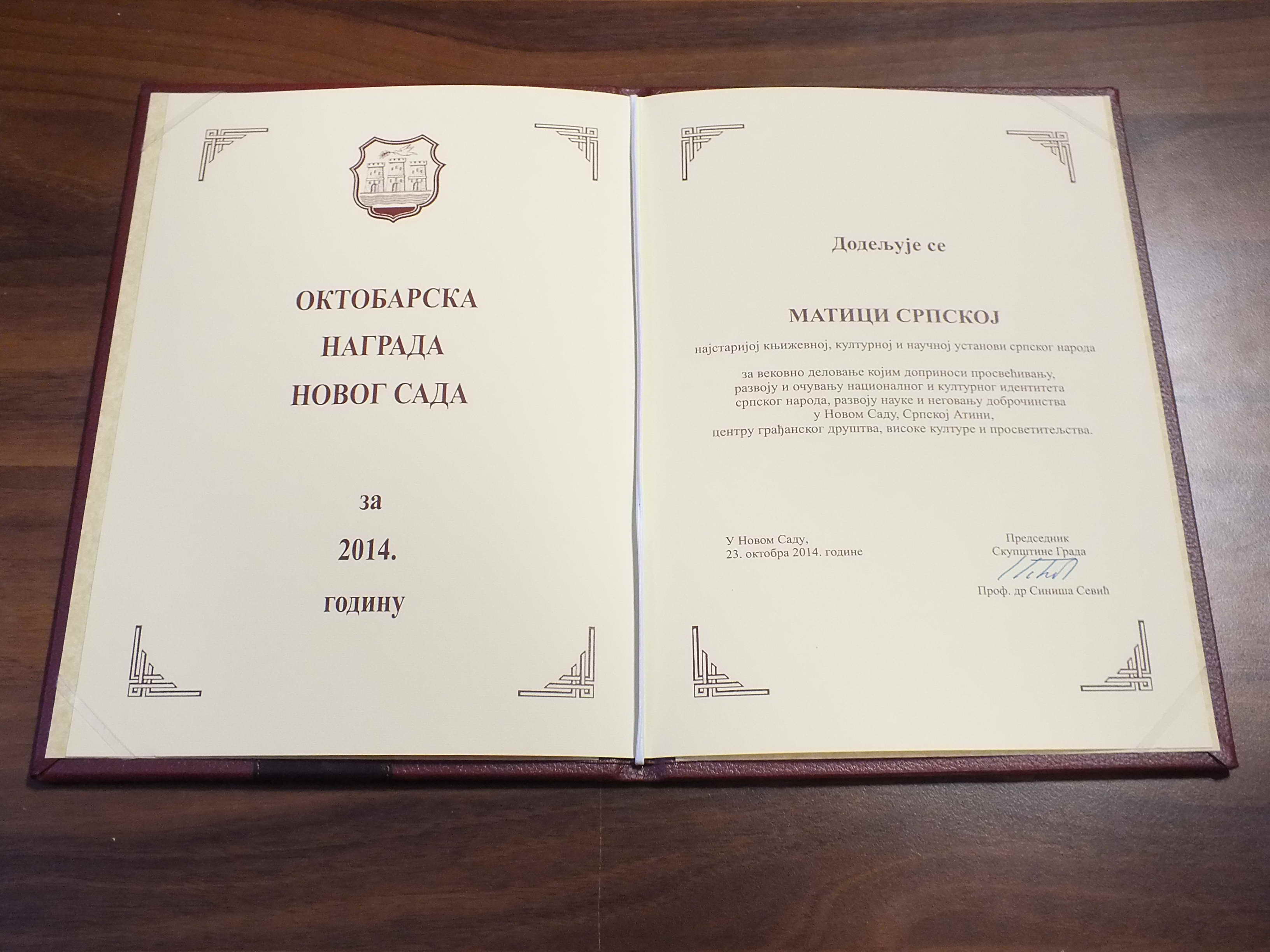Скупштина Града Новог Сада је на свечаној седници одржаној 13. октобра 2014. године, на предлог Комисије за обележавање празника, доделу признања и међуградску сарадњу у земљи и иностранству, донела Одлуку да се Матици српској додели Октобарска награда Града Новог Сада за 2014. годину, као друштвено признање за изузетне резултате у раду и највиша достигнућа и остварења у области привреде, друштвених и других делатности.