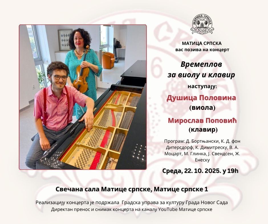 Музичке вечери Матице српске – Времеплов за виолу и клавир, 22.10.2025. у 19h Posted on October 16, 2025 by milan | Leave a reply