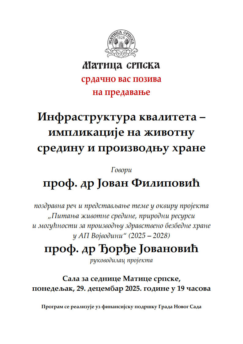 Инфраструктура квалитета – импликације на животну средину и производњу хране, понедељак, 29. децембар 2025. године у 19h Posted on 22 децембра, 2025 by milan | Leave a reply