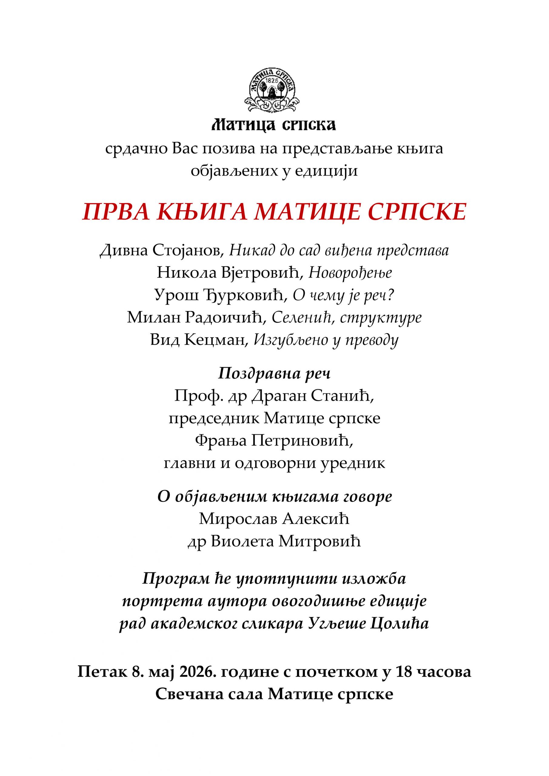 Представљање књига објављених у едицији „Прва књига Матице српске“, 08.05.2026. y 18h Posted on 24 априла, 2026 by milan | Leave a reply