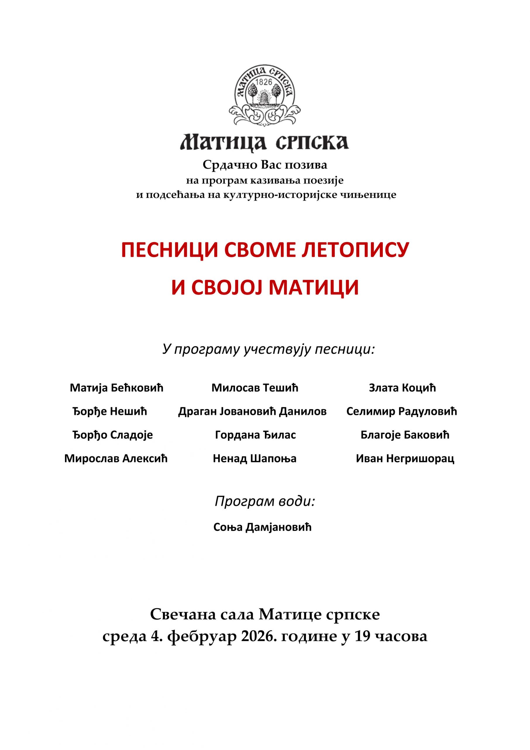 Песници своме Летопису и својој Матици, 04.02.2026. y 19h Posted on 30 јануара, 2026 by milan | Leave a reply